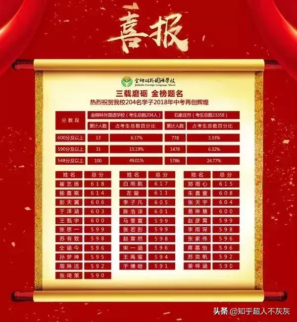 表中数据来源于学校喜报,已经尽可能做到详实可靠,根据40中和金柳林外国语学校的喜报,可以确定2018年石家庄中考成绩600分以上的人数应为778人,但很多网站写做788人,可能是统计口径不同导致的偏差(考生籍贯),这篇文章用“778”这个数字。