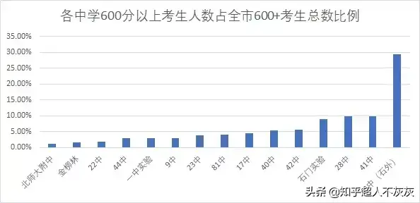 上图出现的15所中学600分以上考生人数总计737人,占全市600分以上考生总人数的95%左右,所以没有出现在表中的学校,基本就没有讨论必要了,下文会提一些比较知名但没有公布中考成绩的学校。