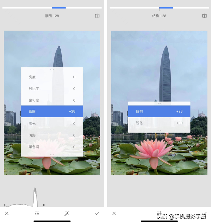 选择“突出细节”,上下滑动可以看到“结构”和“锐化”两个参数,适当增加一些,然后点击“√”确定。