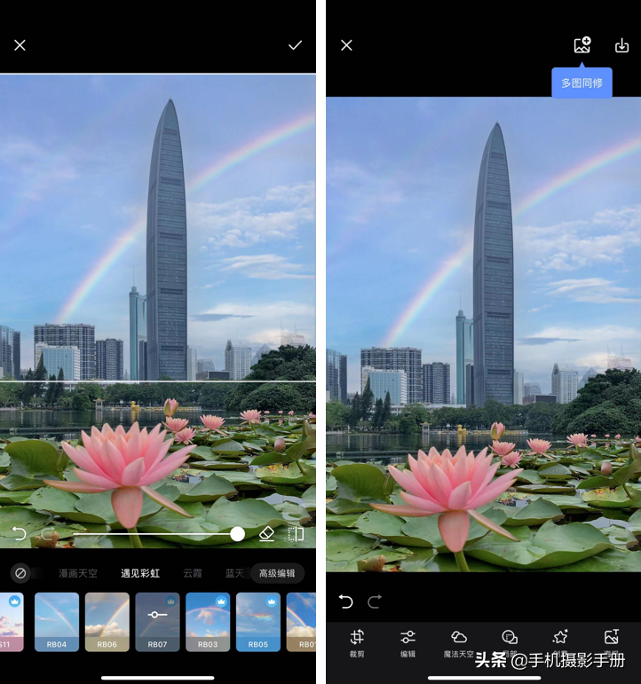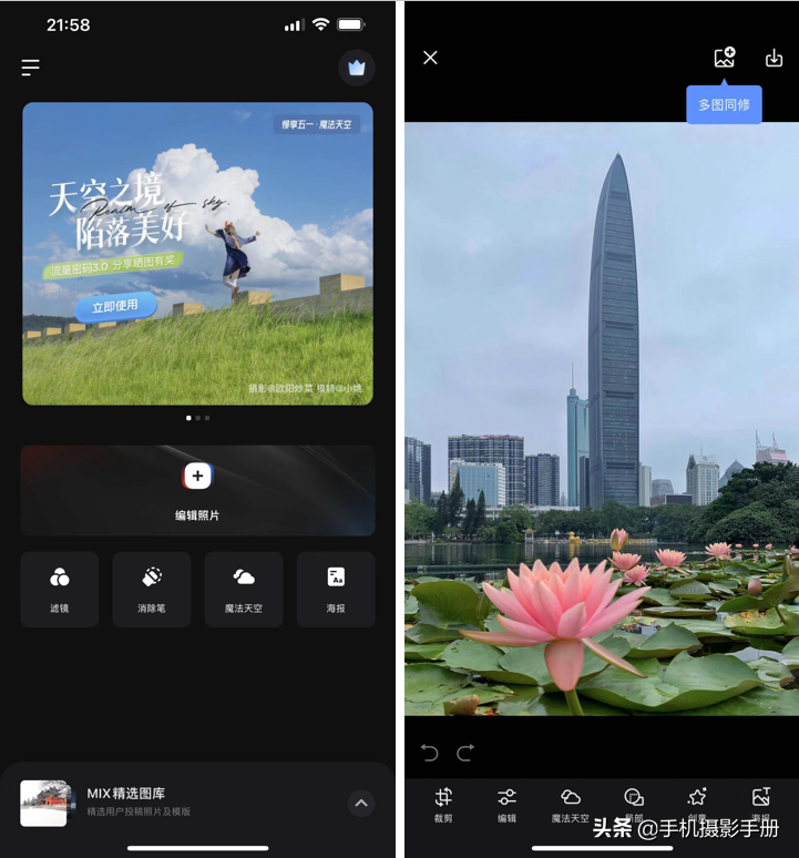 打开MIX,点击“编辑照片”,把snapseed导出的照片选中,点击“魔法天空”。