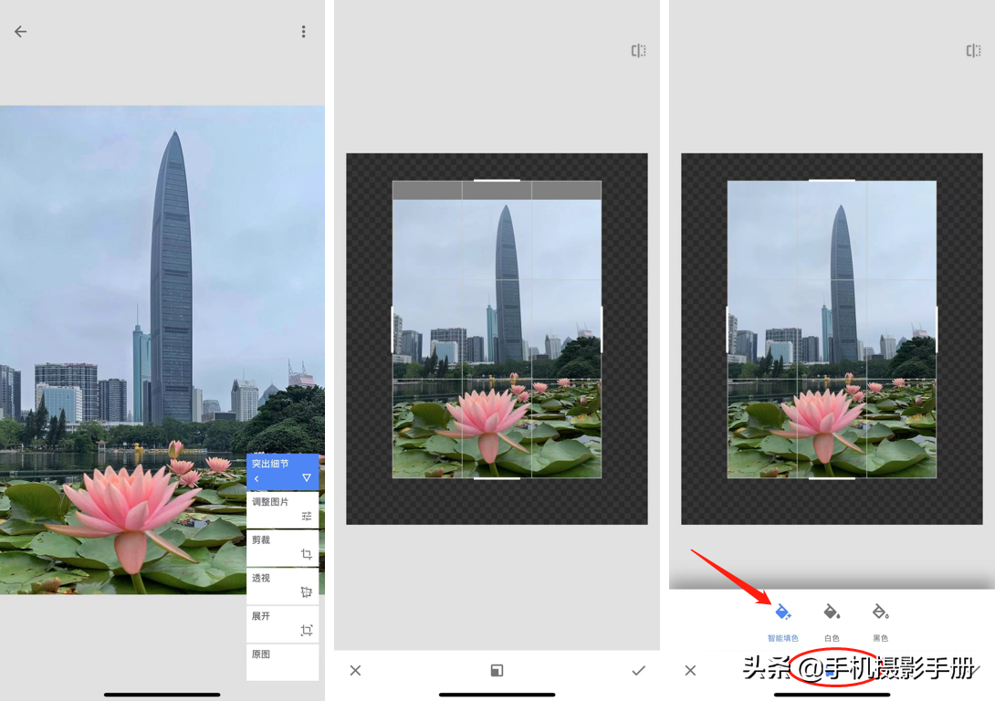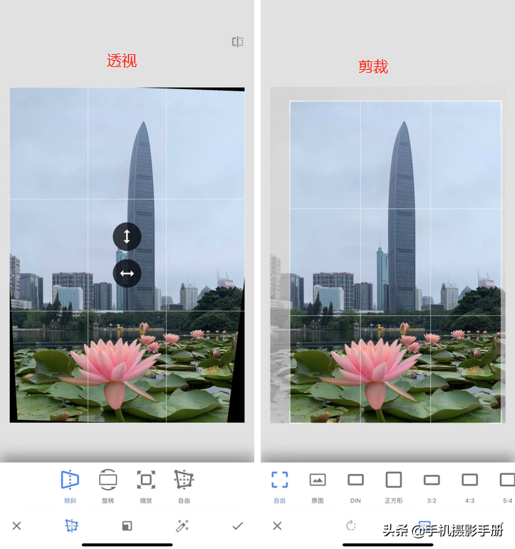 从“工具”中选择“透视”,找到其中的“旋转”,用手指按住照片横向移动,确保中心建筑正直。然后选择“倾斜”,按住照片往下滑动,直到两侧的建筑横平竖直为止。点击“√”确认。