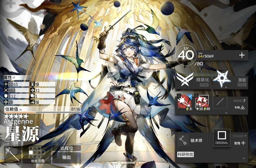 面板数据:五星术士干员,星源。她的特性是“攻击造成法术伤害,且会在4个敌人间跳跃,每次跳跃伤害降低15%并造成短暂停顿”,属于子职业“链术师”。她们输出与控制能力兼备,擅长处理群聚的多目标敌人。