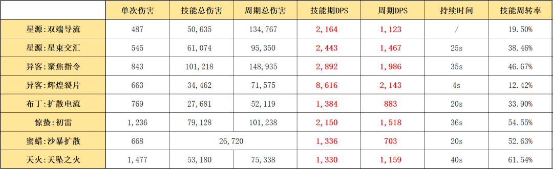 我们能够清晰地看到,星源的输出非常均衡、但欠缺爆发,整体输出水准能齐平惊蛰,二技能的表现相对更佳。虽然星源在开启技能后,获得的攻击率倍率仅有可怜的25%至40%,与其他链术师的动辄100%+几乎不能完全比较。