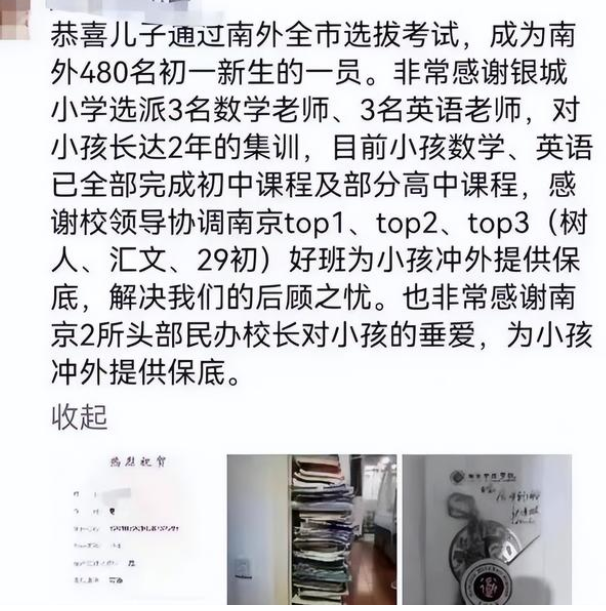 在此之前一所小学选派了6名老师对该生进行集训,2年时间就完成了初中的全部课程和高中的部分课程,不仅是这所学校的帮助,还有南京前三初中的好班给学生保底,这样的人脉和课程,不是一般家庭能够做到的。