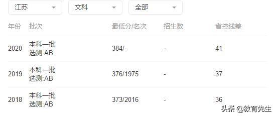 而在江苏省文科录取最低分数:2018年是373分,2019年是376分,2020年是384分。无论是理科还是文科都是超过省控线的30分以上。