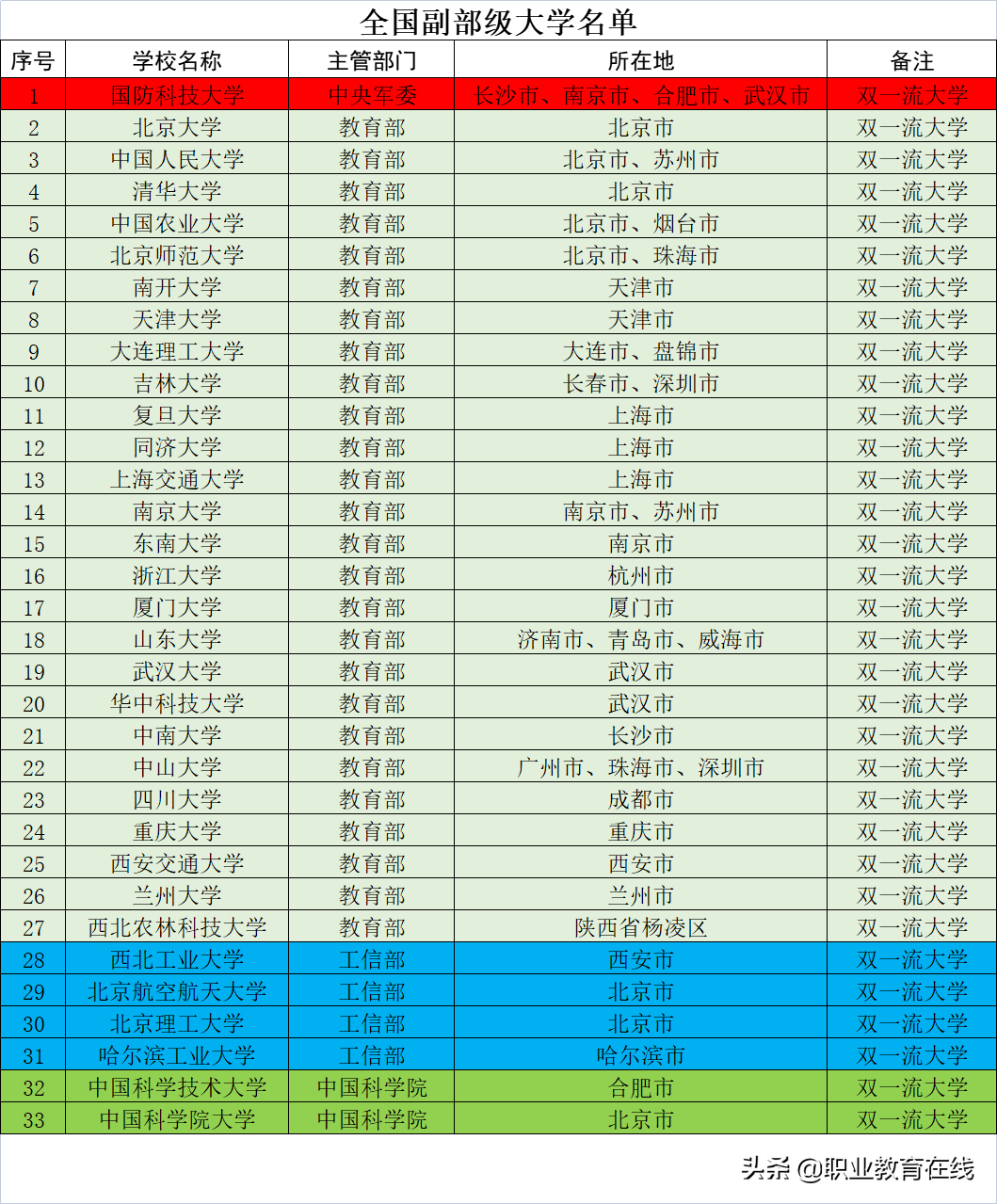中国的特殊体质,高校是有行政级别的,一般普通本科院校是正厅级,但我们还有33所大学是副部级大学,这也是名牌大学的一项标志。