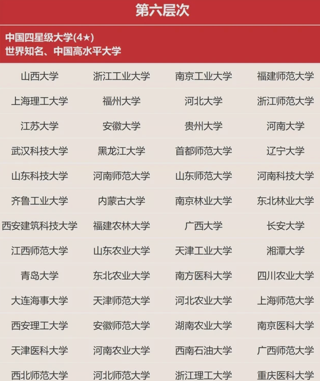 第六层次就是没有什么光环的本科大学了,但其中有一些也是不错了,像上海理工、广西大学、长安大学等,很多带有省级名头,教育投入很高,各项学科建设也都不错,学生适当考虑。