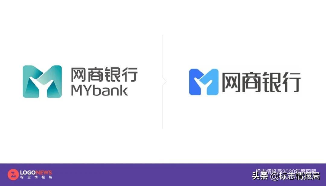 6月初,网商银行更新了LOGO,最大的变化是将「M」图标中的渐变色改为两种不同深度的鲜艳蓝色。另外,在图文组合中,新版LOGO直接采用了图形和中文名称的组合,下方的英文名称「MYbank」被移除。