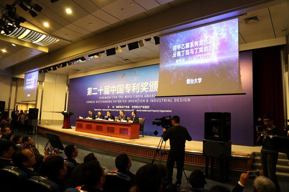 12月25日下午,由中国国家知识产权局和世界知识产权组织共同主办的第二十届中国专利奖颁奖大会在北京举行。烟台大学专利“用甲乙酮系列混合溶剂分离丁烷与丁烯的方法”荣获中国专利金奖。小编在颁奖现场见证了这一刻,内心真是激动澎湃。