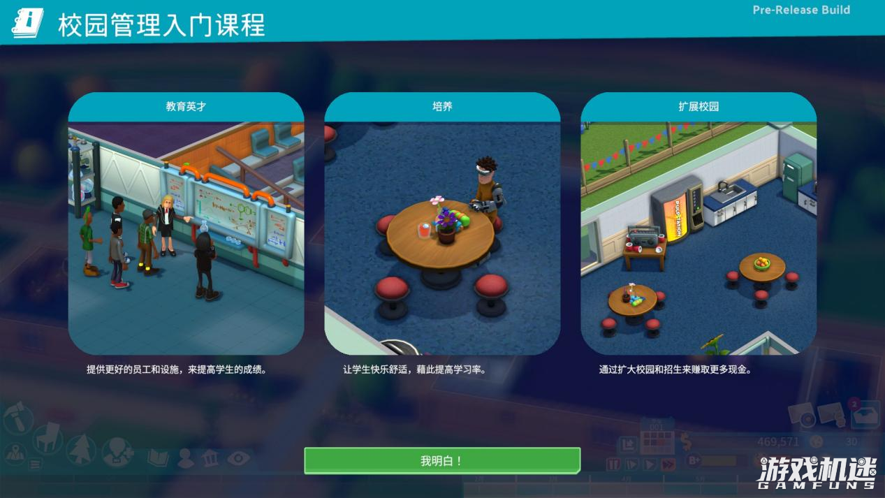 在游戏内的第一关中,游戏内不仅仅指引我们建立各种教学设施除此之外玩家还需要建立如宿舍、卫生间、淋浴间等房间为学生改善生活条件;从这里来说学生的需求尚且在正常的范围之内,但是这仅仅是开始而已,学生的需要不仅仅是有地方住和能够洗澡,随着关卡推进玩家会感到学生和教师基本都不满足于现状,玩家在完成上述三个基础房间的建造后紧接着要建造的就是学生休息室和员工休息室,说是休息其实就是给学生和教师娱乐玩耍的。在“玩”的上面游戏内同样具象成了一种属性——娱乐