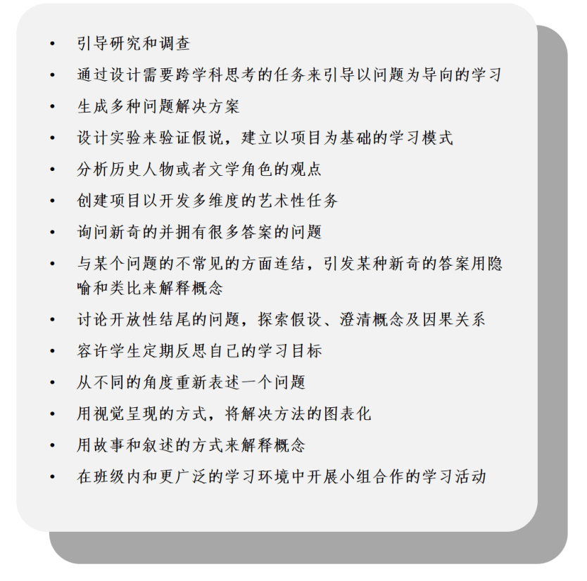 提升创造性思维,或者更广义的教授21世纪技能,都需要教师不仅能够传授知识,而且能够为学生提供很多机会参与活动,这些活动能够激发发散性思维,也就是说产生新的、不同方向自由流动的想法。教育者们可能习惯于引导学生用一种方法解决一个问题,对教育者来说的挑战就是在课堂上改变这种对“唯一正确答案”的过度寻求。