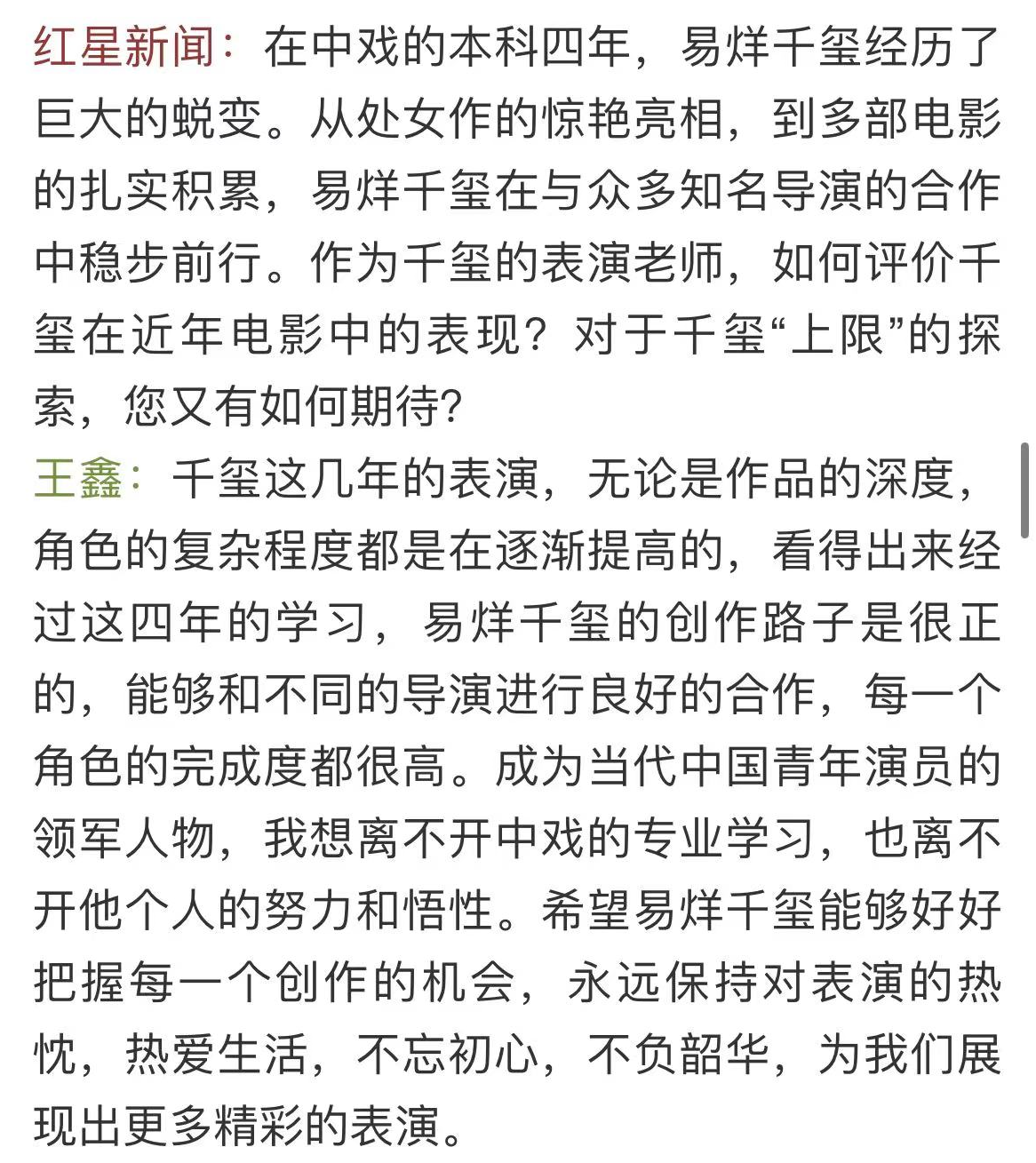 作为2018级表演系老师,演员王鑫给予了这届很高的评价,直言是“星光熠熠”的一届。他还用简短的词语去形容每一个人:易烊千玺沉静,胡先煦活泼,李兰迪灵动,罗一舟刻苦。