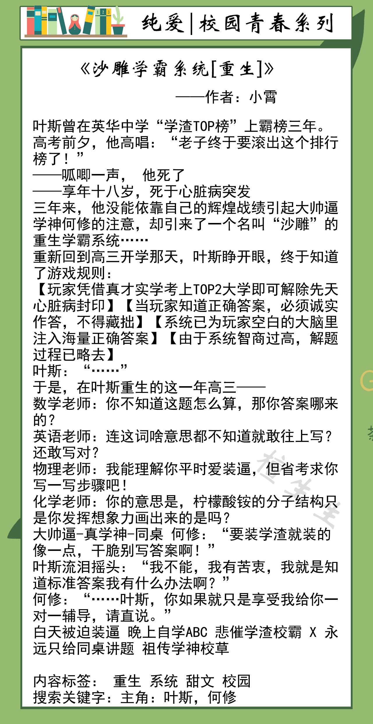 小短评:很努力的学渣叶斯VS祖传学神的校草何修。主线剧情大概就是心脏病突发猝死的叶斯拥有了一个沙雕时光系统,这个系统以让他身体健康诱之,给叶斯脑内注入海量答案,想把叶斯从学渣拔苗助长成学霸,但只塞答案却没给解题过程,无奈的叶斯只好求助于同班学神何修,然后过上了一起学习、帮忙讲讲题、顺便谈谈情的励志生活。双向暗恋高甜文,文笔诙谐、基调温暖,文中系统是批发投瓣 ,各种款式全面开放,就是基本上很中二,会让人笑出腹肌的那种!