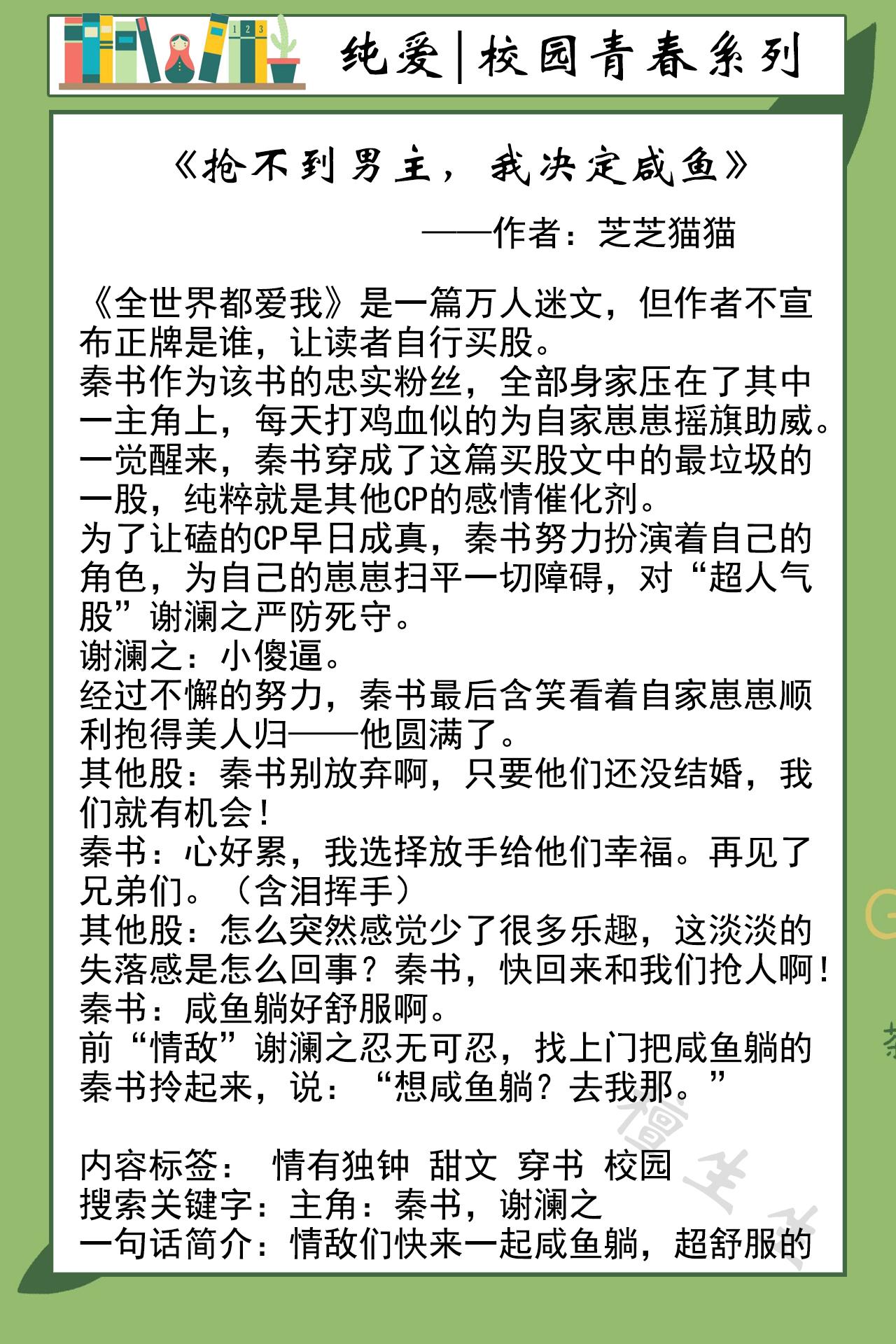 小短评:护崽狂人秦书VS钓鱼达人谢澜之。秦书是男频小作者,就是写不出感情戏,为了学习经验,就挑了一本万人迷文看,结果入了迷,每天疯狂嗑CP,掉到书里,仍然不改初心在线硬磕,充当剧情神助攻,时不时为主角们的感情进展推波助澜一番,并严守死防他崽崽的情敌们,特别是最优质的那位情敌,秦书视他为眼中钉,不惜把自己折进去,也要换来崽崽幸福美满……
