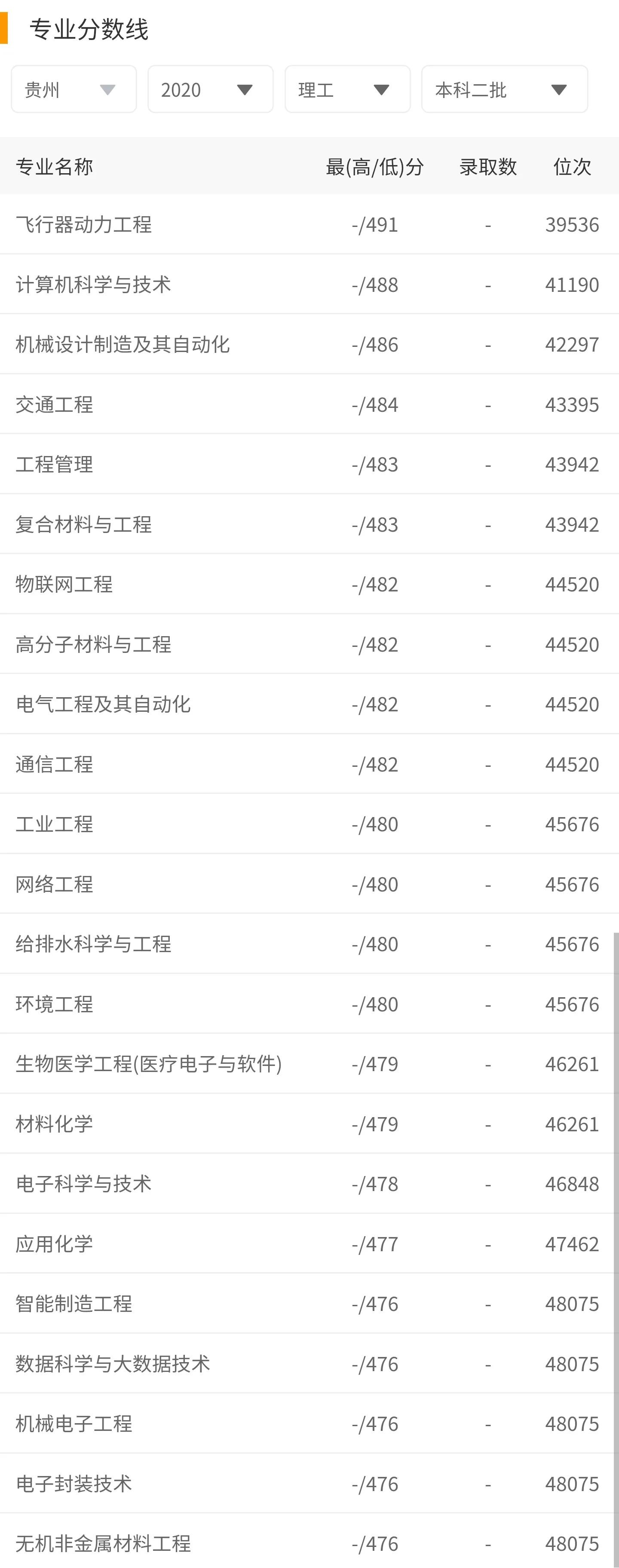 南昌航空大学一本在贵州录取的最高分,都是其核心专业飞行器制造工程、飞行器设计与工程等专业。其它的专业都是与航空相关的电子信息工程,土木工程,测控技术与仪器,材料成型及控制工程,自动化,金属材料工程,焊接技术与工程等专业,最低录取位次是34,000名。