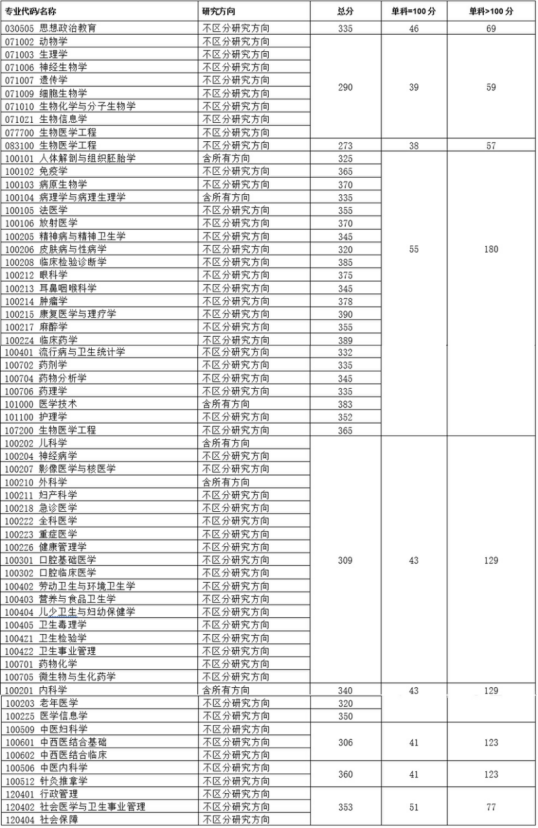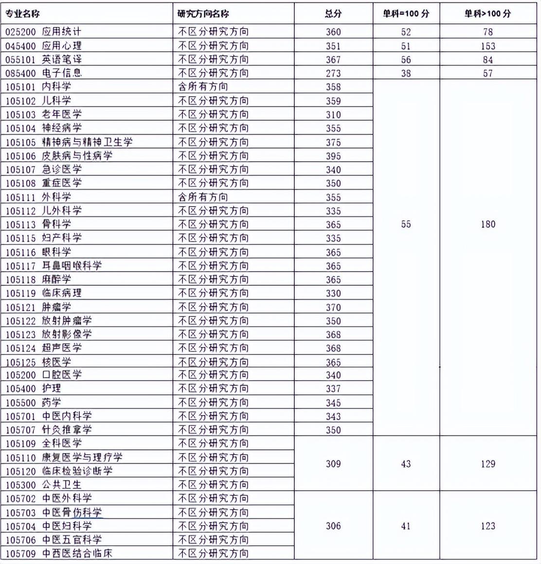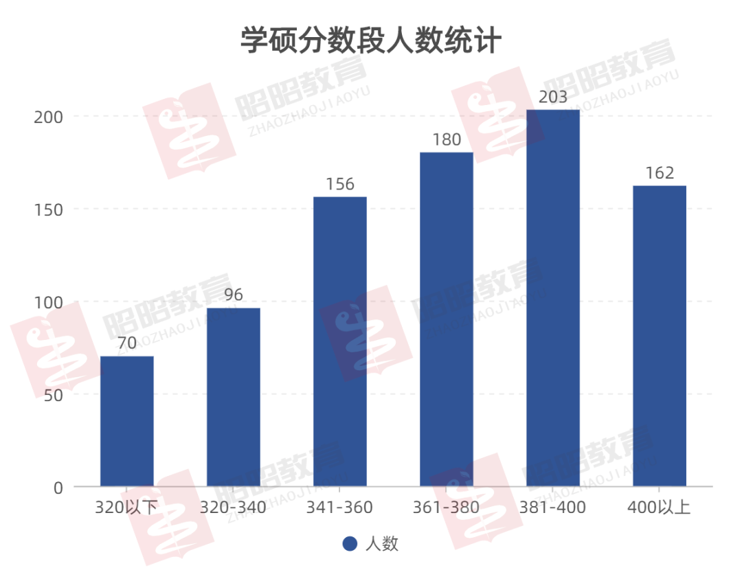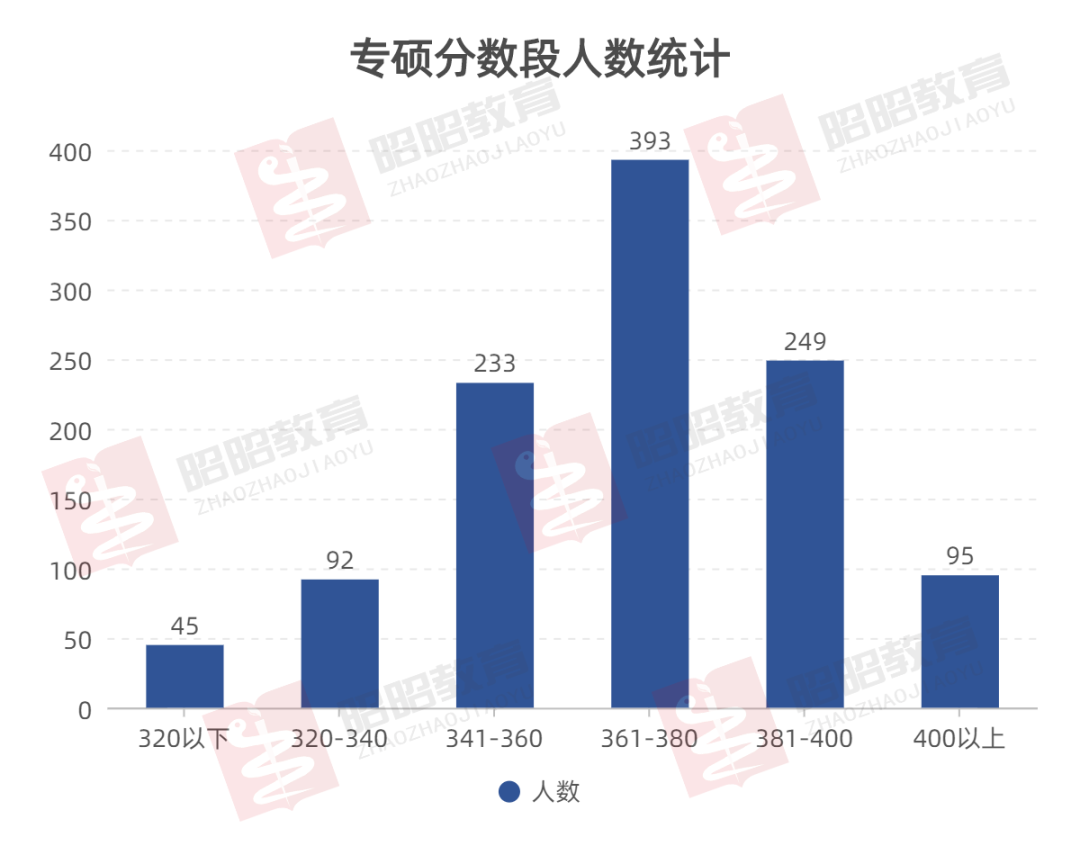 专硕:除特殊政策外,最高分为431分,报考外科学专业;最低分为280分,报考的是电子信息专业。平均分数为369分,大部分考生分数段趋于361-380分之间。