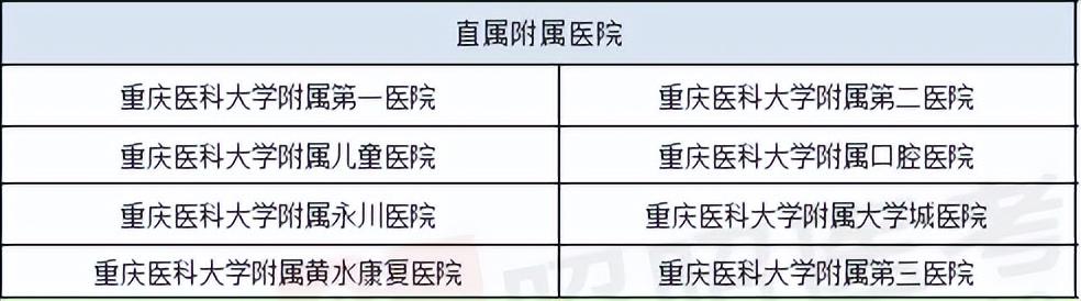 非直属附属医院:重庆医科大学内江附属医院(内江市第一人民医院)、重庆医科大学涪陵附属医院(涪陵中心医院)、重庆医科大学北碚附属医院(重庆市第九人民医院)、重庆医科大学附属凉山临床学院(四川省凉山州第一人民医院)、重庆医科大学附属成都第三临床学院(成都市第二人民医院)、重庆医科大学附属成都市妇女儿童中心医院(成都市妇女儿童中心医院)、重庆医科大学附属深圳儿童医院(深圳市儿童医院)、重庆医科大学附属成都第一临床学院(成都军区总医院)、重庆医科大学附属成都第二临床学院(成都市三人民医院)