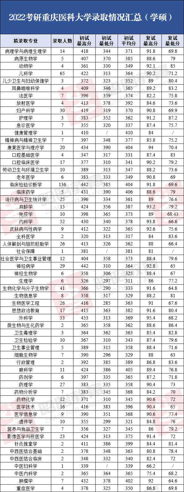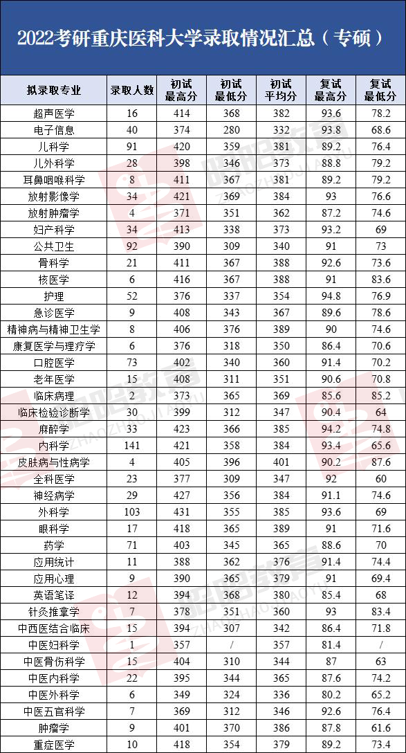 重医专硕去年有14个专业的最高分都超过400,今年有20+专业都有400分以上的了,专业平均分的平均分360+以上了!