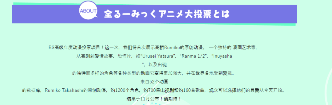 近段时间,NHK BS Premium正在开展高级年度动漫投票项目,本次投票主题内容为“高橋留美子原创的动画作品的美少女动画角色大投票”。