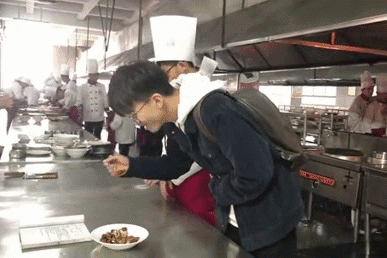 烹饪学院有4楼。每一楼主修的专业都不一样,比如这一楼的学生紧张而忙碌地在制作猪大肠。