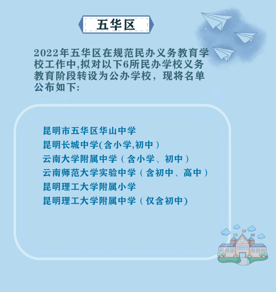 根据《中华人民共和国民办教育促进法实施条例》《教育部等八部门关于规范公办学校举办或者参与举办民办义务教育学校的通知》《云南省教育厅等八部门关于印发规范公办学校举办或者参与举办民办义务教育学校工作方案的通知》等文件要求,3月30日,昆明市陆续公布规范民办义务教育学校名单。