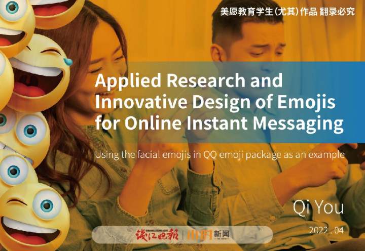 为了完成这个目标,在短短一个月的时间,美愿团队获得了国内知名大学国家级数字艺术媒体实验室的支持,一起辅导尤其同学的新领域的研究——网络即时通讯中表情符的应用调研与创新设计。有别于先前申请时递交的视觉艺术作品,这是一个全新的研究、创作。数字化艺术媒体的再设计是基于网络时代通过即时通讯软件QQ来进行改革,考虑到QQ的广泛使用扩充了学生群体之间的社会交往机会,丰富了人际关系的内涵,还发展了虚拟人际关系,对增进学生群体之间人际关系具有一定积极的作用。目前QQ表情包中的脸型表情图符并不能完全满足网络交往中人际表达的需要,所以进一步通过创新设计的方式补充一些实际需要的QQ脸型表情图符。