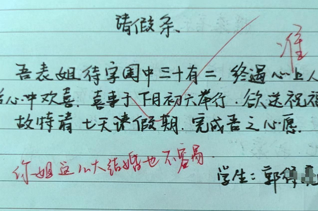还有一位同学写的非常可爱的请假条,也是文言文的形式的请假条,大概翻译的意思就是家里有姐姐结婚了,姐姐已经32岁了,所以他要请假几天去参加家家的婚礼,不得不感叹初中生的文言文学得还真是挺棒的。