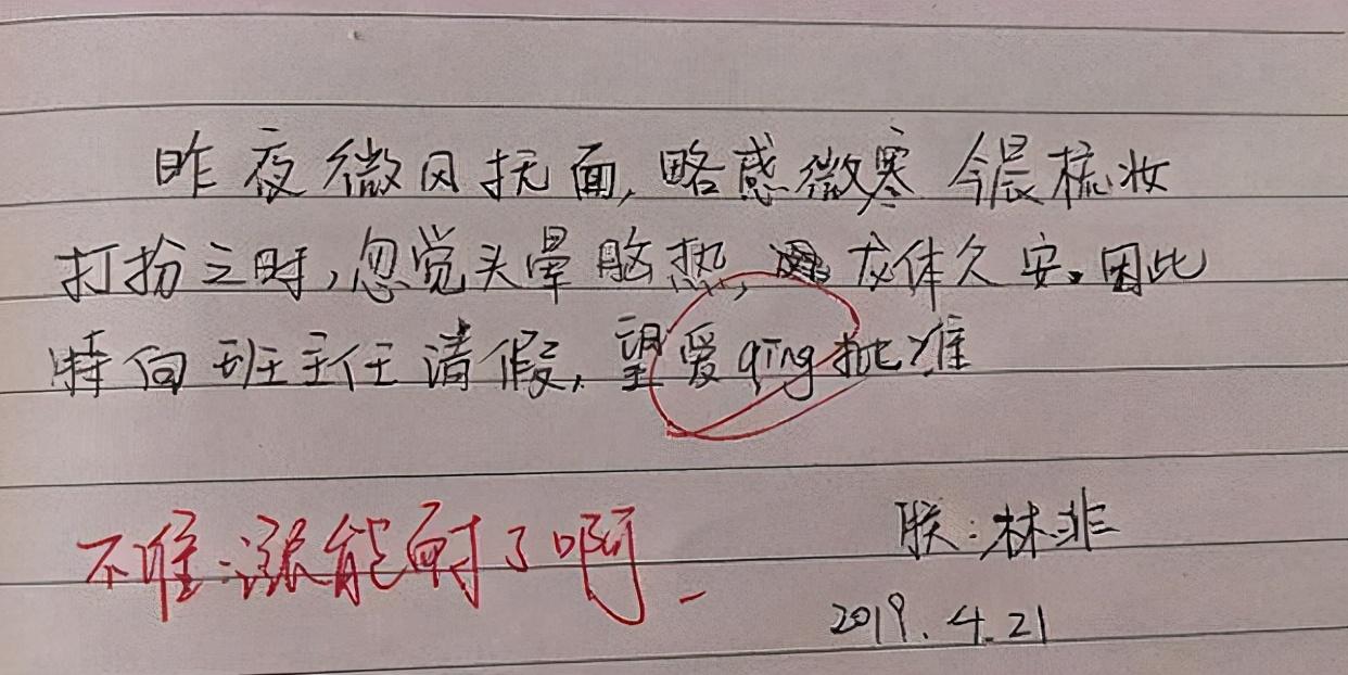 版权声明:我们致力于保护作者版权,注重分享,被刊用文章【学校老师请假条格式(初中生的请假条火了)】因无法核实真实出处,未能及时与作者取得联系,或有版权异议的,请联系管理员,我们会立即处理! 部分文章是来自自研大数据AI进行生成,内容摘自(百度百科,百度知道,头条百科,中国民法典,刑法,牛津词典,新华词典,汉语词典,国家院校,科普平台)等数据,内容仅供学习参考,不准确地方联系删除处理!;