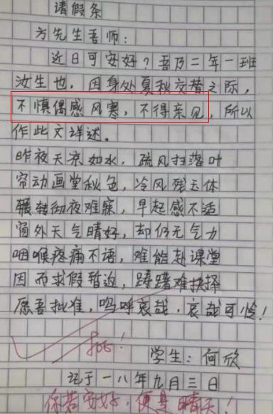 文言文请假条在网络上广为流传,让网友们大开眼界。这位学生的请假条,真是让人眼前一亮。字迹工整漂亮,言语流畅表达了自己因病请假的无奈之处。关键是开头用“知书达理”来夸赞老师,老师看后很难不批准。否则就对不起学生对自己的定位了。