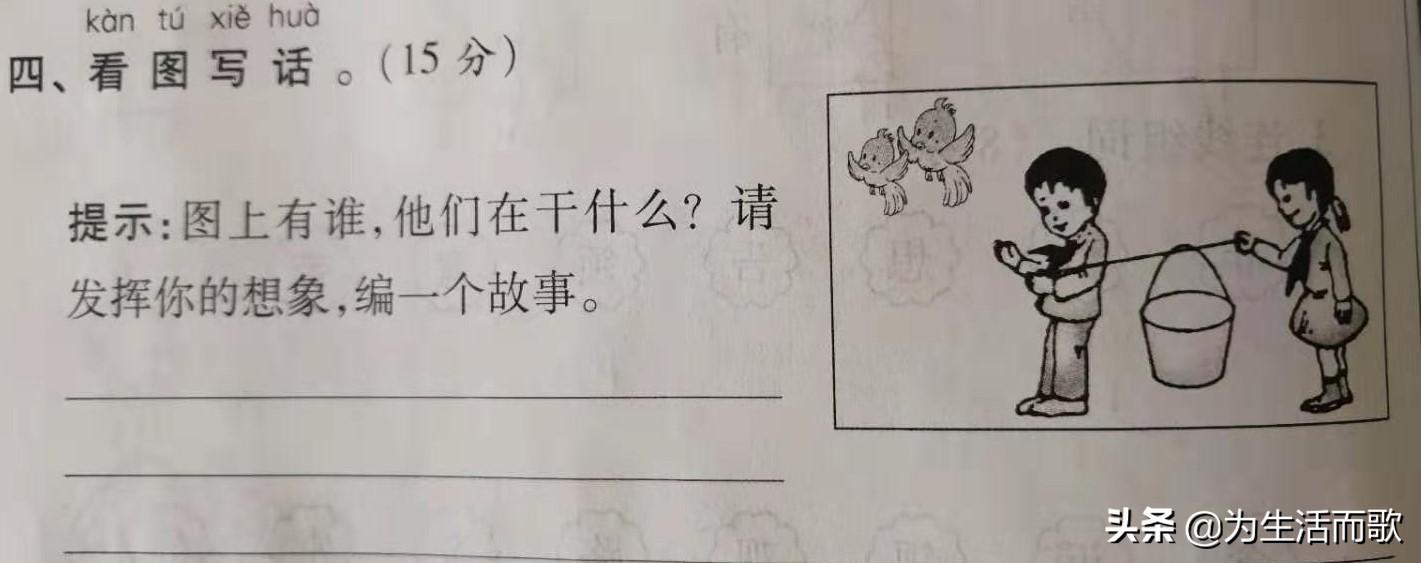 我要想一想:他们去抬水干什么?自己喝吗?肯定不是。那给谁喝?原来是给树木喝。春天里,万物复苏,这应该是一个植树的场景。再想一想小鸟在干什么?是叽叽喳喳地歌唱,还是夸赞两位小朋友呢?