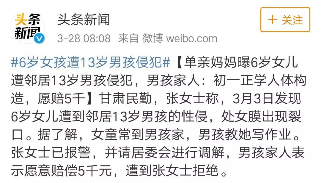 2019年3月3日,甘肃的张女士向公安局报警,称自己年仅6岁的女儿果果(化名)遭到邻居家13岁男孩的性侵。