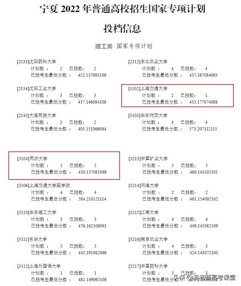 院校位置之好、知名度之高、综合实力之强的上海交通大学和同济大学却在宁夏高考国家专项招生中遇冷了,上海交通大学招生最低分433分,未招满,同济大学招生最低分430分,超宁夏理科一本线18分,让人万万想不到分数如此之低啊。