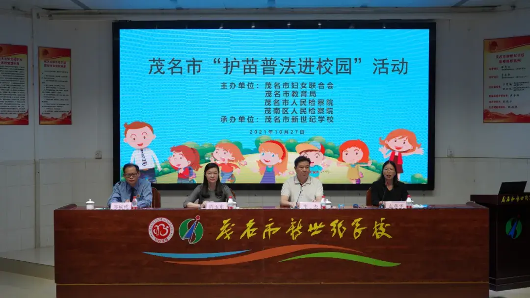 为加强未成年人法治宣传教育,提高未成年人的自我保护意识,共同促进未成年人健康成长,日前,由市妇女联合会、市教育局、市人民检察院和茂南区人民检察院主办,茂名市新世纪学校承办的“护苗普法进校园”活动在市新世纪学校中学部阶梯课室举行。市妇联、市教育局、市人民检察院等单位相关负责人和市新世纪学校师生共1000余人参加或收看本次活动。