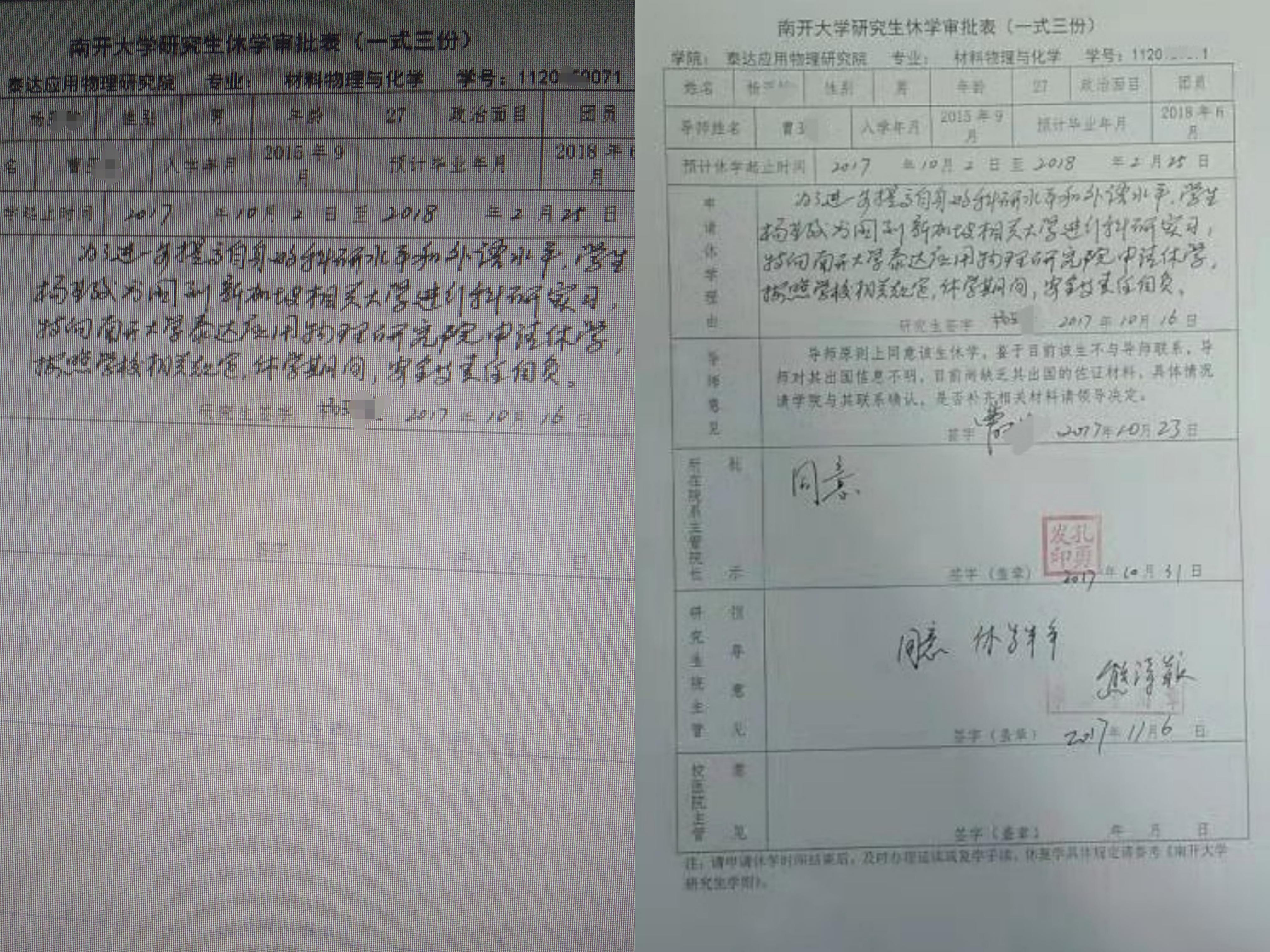 杨光只好领了一张空白的《南开大学研究生休学审批表》,但当时杨涛已经去了新加坡,本人无法签字。
