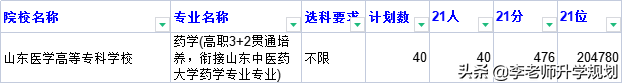 2021年,山东高职贯通培养专业的最高录取分数线,是山东中医药高等专科学校衔接山东中医药大学的药学专业,最低投档线476分,位次204780。