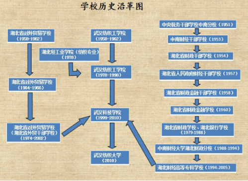 武汉纺织大学的前身是始建于1958年的武汉纺织工学院,是原中国纺织工业部所属的行业院校,1999年学校更名为武汉科技学院。原湖北省对外贸易学校、湖北财经高等专科学校先后并入,2010年更名为武汉纺织大学。学校历经六十余年的发展,现拥有四个校区占地2000多亩,有各级各类全日制在校生20000余人。