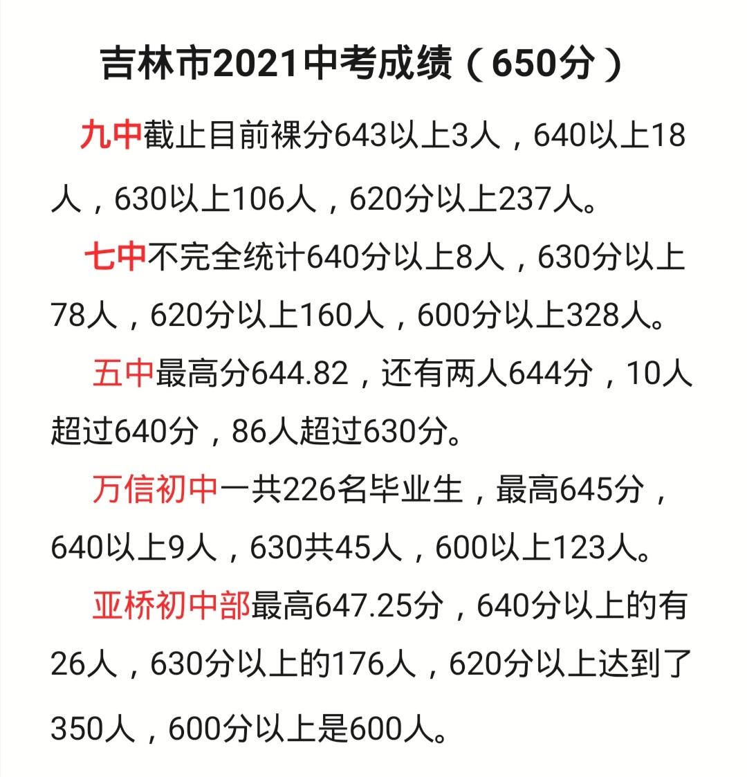 高分众多。仅以网传的吉林市的部分初中为例,中考总分才650分,万信九年制学校初中部共226人,600分以上的就有120多人,占50%以上。成绩如此惊人的学校还有不少。