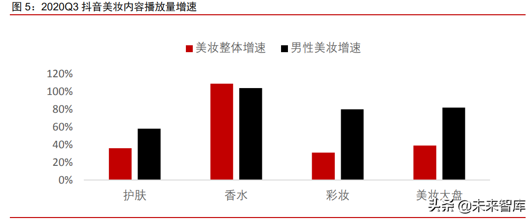 男性彩妆消费空间广阔。根据艾媒咨询数据,2020 年,00 后男生购买粉底液的增速 是女性的 2 倍,眼线的增速是女生的 4 倍。根据巨量算数数据,2020Q3 彩妆内容播放中, 整体增速为 31%,而其中男性彩妆增速为 80%。美妆大盘内容播放量上,整体增速为 39%, 男性美妆增速为 82%,明显高于整体增速水平。年轻男性的美妆消费潜力明显。