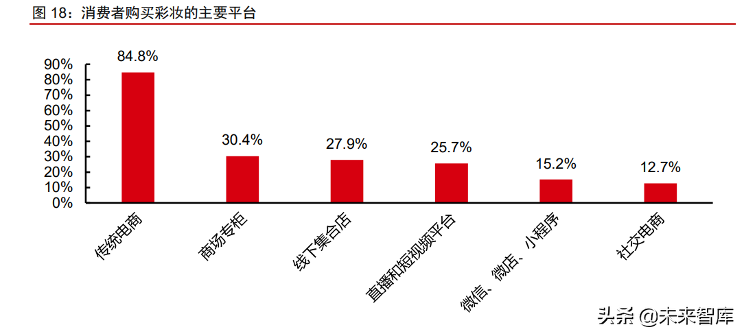 线上:传统电商仍占据主要线上渠道,抖快等社交电商为后起之秀。根据中妆网的数 据,在传统电商/抖快等短视频平台/其他线上社交平台购买彩妆的消费者分别占 85% /26%/28%。彩妆是最早入场抖音电商的品类之一,凭借成熟的销售模式和不断扩大的受 众,彩妆销售额在抖音的月均复合增长率达到 15.2%,超过全品类的平均增速。