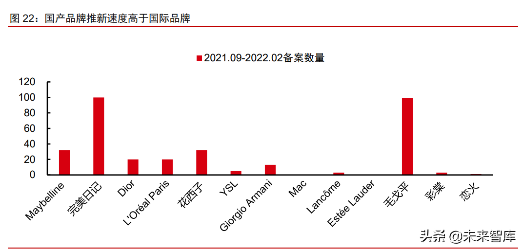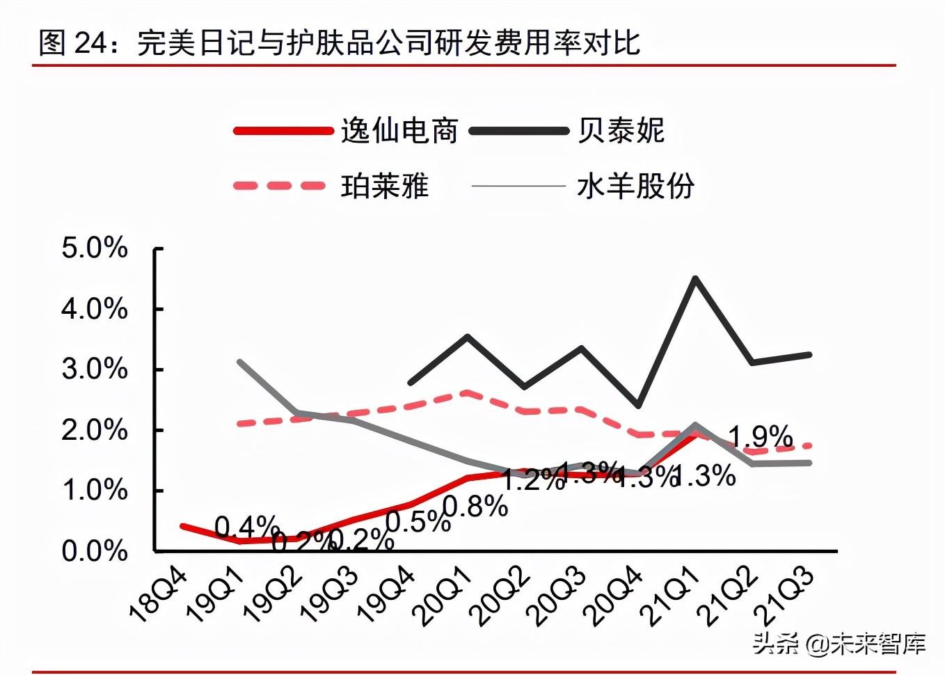 彩妆研发投入低,产品升级注重包材与设计。护肤品的功效属性强,产品迭代速度较 慢,注重基础研究和配方更新。与护肤品相比,彩妆的时尚消费属性更强,产品更新更快, 主要是外观的更新,因此研发投入较低。根据天眼查数据,护肤品牌薇诺娜/自然堂/夸迪 的专利数量分别为 132/355/304 件,其中发明专利超过半数,而彩妆品牌花西子/完美日记 /珂拉琪的专利中,发明专利占比显著较低。此外,彩妆品牌研发费用率较低,完美日记在 2020 年加大了研发投入,21Q1 研发费用率为 1.9%。