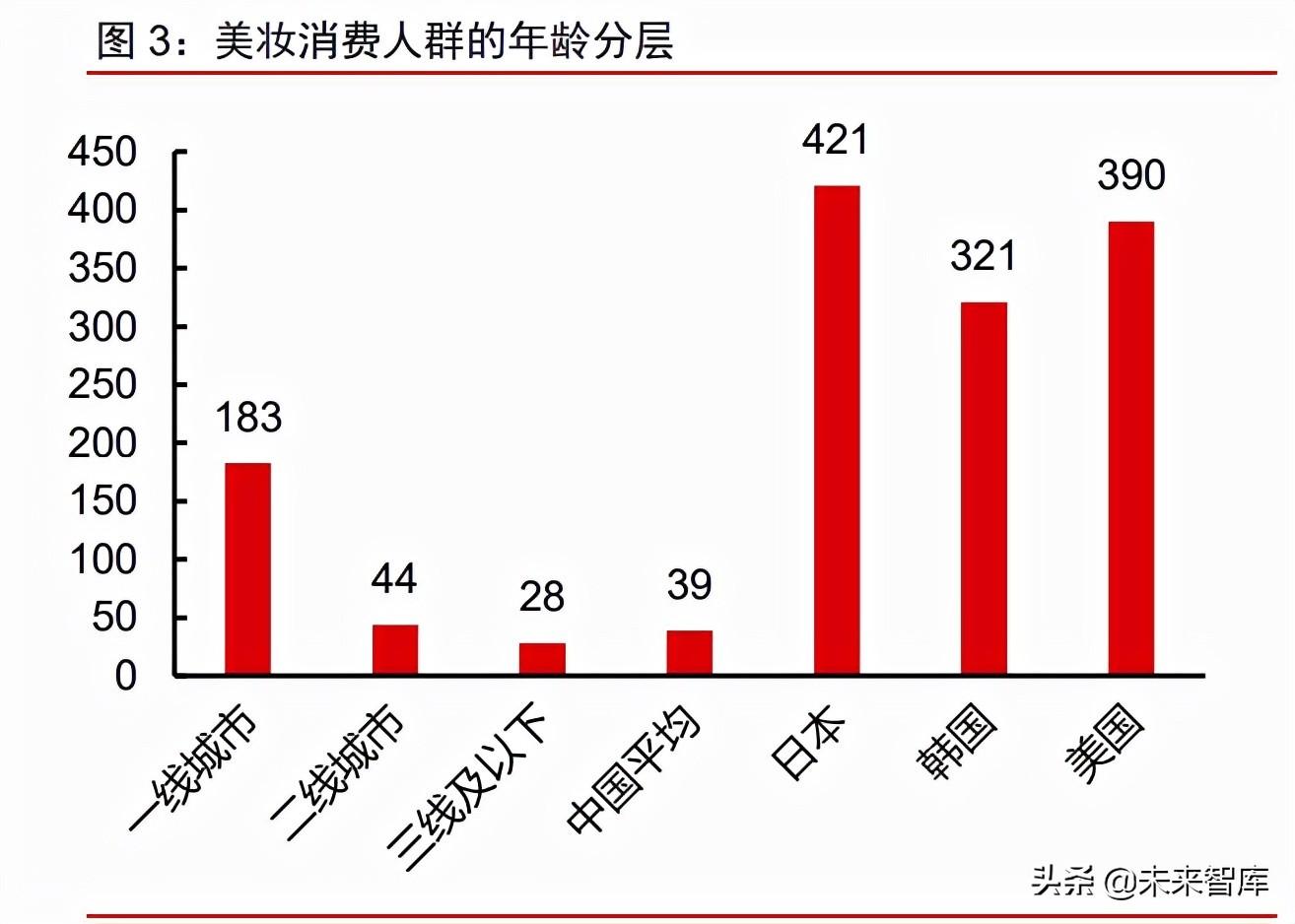 随着收入水平提升,同时社媒崛起使得彩妆消费者教育普及,彩妆消费越发普遍化、 渗透率不断提升。2015 年至 2019 年,彩妆渗透率从 31.6%大幅提升至 48.8%,彩妆消费 人群不断扩容。对比日美国家,中国人均彩妆消费具有明显的提升空间。2019 年,我国 人均彩妆产品消费金额为 39 元,远低于日本/韩国/美国的 421/321/390 元,仅为其人均消 费额的 1/10 左右。我国一线城市的人均彩妆消费额为 183 元,远超二线及以下城市,但 仍不及欧美、日韩等国的 1/2。