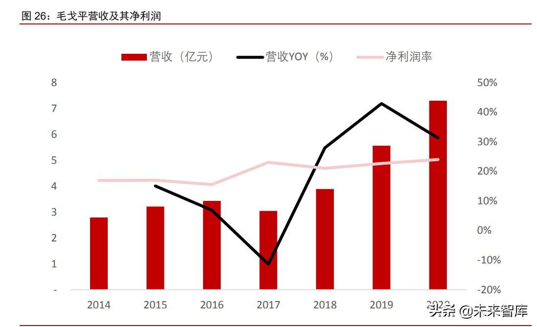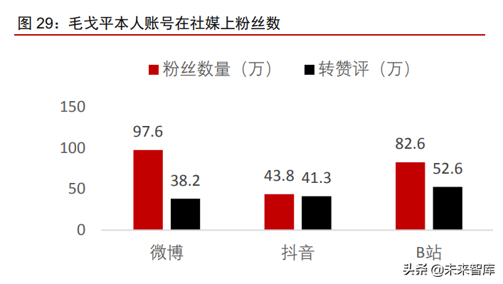 2019 年后受益于国风潮崛起,毛戈平作为中国妆专家成功出圈,带动了品牌知名度 上升。2019 年,毛戈平与美妆博主“深夜徐老师”合作化妆视频,获得热搜和超 13 亿播 放量。此后频繁和赵露思、胡兵等明星、博主合作。2019 年-2021 年,毛戈平 11 次出现 在热搜榜上。此外,毛戈平还在微博、B 站、抖音发布化妆教程,为品牌站台吆喝,粉丝 数分别达到了 97.6 万、82.6 万和 43.8 万。
