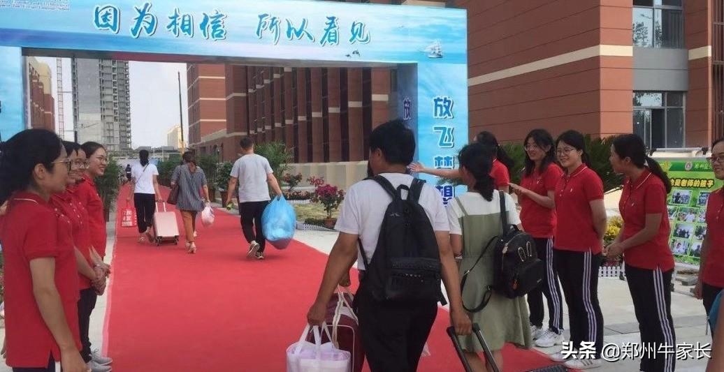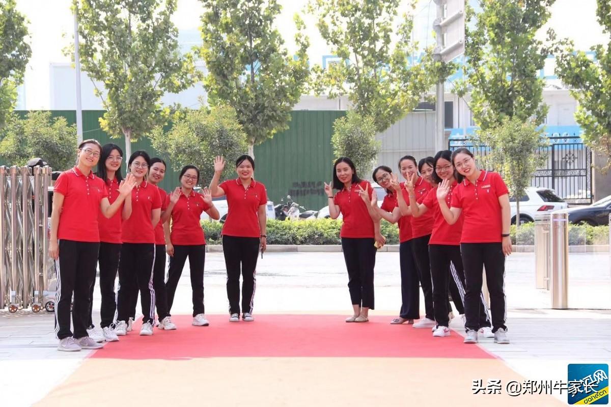 身穿红色短袖,早已准备就绪的教师迎宾队在“因为相信 所以看见”拱门前与同学们打着招呼“郑州经开区外国语学校欢迎你们,欢迎孩子回家!”