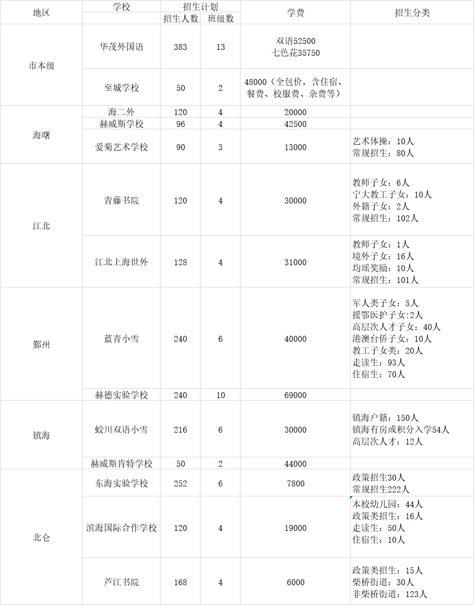 首先,看一下2020年宁波市区民办学校,新生招生计划表: