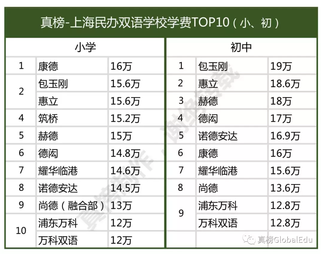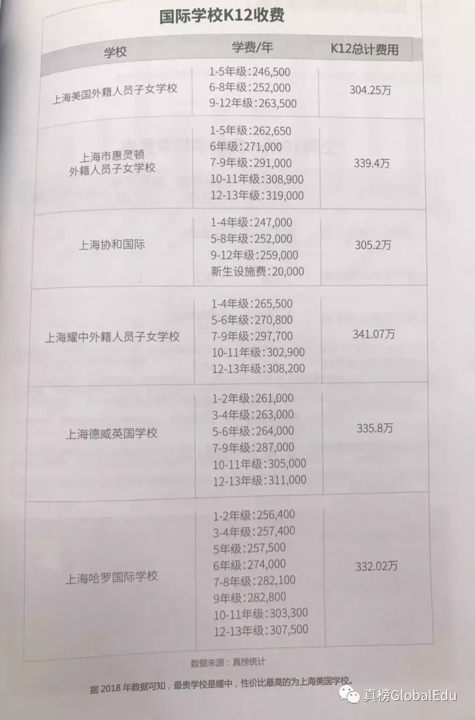 整体而言外籍学校的收费比双语学校平均收费贵出30%-50%。真榜君之前做过统计,读完外籍学校12年普遍花费在300万左右。沪上学费30万/年以上的六所学校均为外籍学校的高中部,其中耀中全上海滩学费最贵,读完12年总计要340万人民币左右。