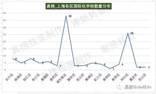 上海两大国际化学校分布区落在东西两边:西边的闵行区,东边的浦东区。两区的学校数量共计64所,浦东新区38所,闵行区26所,共占比超过50%。