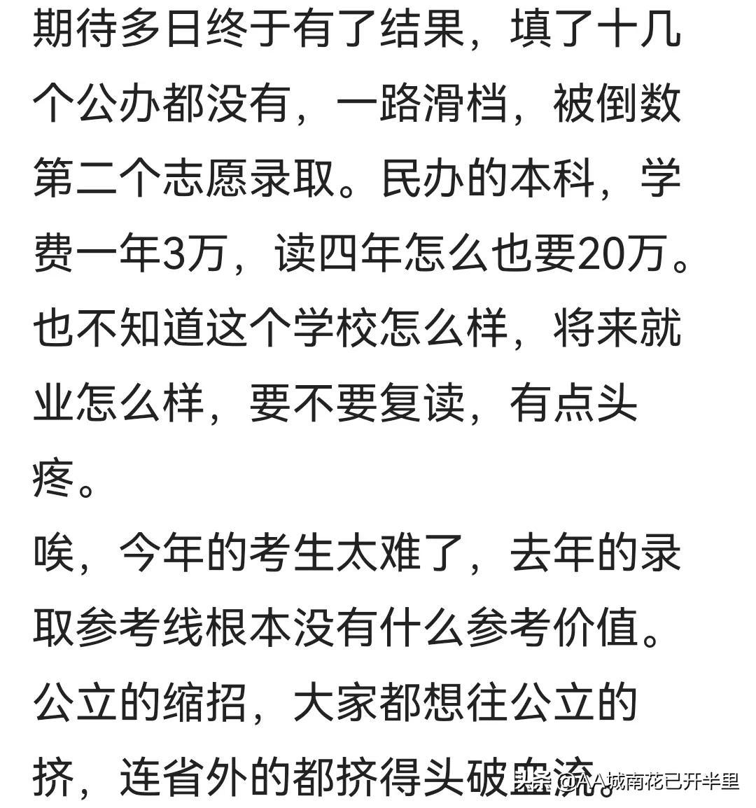 我家孩子填报了六十五个志愿,第六十一个录取的,也是民办,而且是最次民办,学费24000,孩子一直在纠结要不要复读?考虑了五六天了,也拿不定注意,有时我看见她一个人在偷偷的哭,上吧,不甘心,不去报道,明年又充满了未知和不确定因素,这种大事让孩子一个人独自面对,还要做出抉择,对她来说太难了。