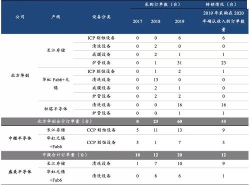 华虹系对中微半导体的采购主要集中在CCP介质刻蚀,2019年1-12月华虹无锡共下单7台。我们按照招股说明书中单个的腔体价格估算出2019年华虹体系对中微刻蚀设备的收入贡献为0.9亿元。同样由于收入确认晚于下达订单约3个季度,因此部分2019年订单转销至2020年确认收入,该部分金额约为0.7亿元。