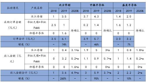 2019年1月至12月初,华虹无锡厂在北方华创共采购刻蚀设备 2台,PVD1台,炉管2台,我们预估2019年全年华虹系产线采购金额为1亿元,对北方华创收入拉动作用明显增长。由于收入确认晚于下达订单约3个季度,因此部分2019年订单转销至2020年确认收入,该部分金额约为0.22亿元。