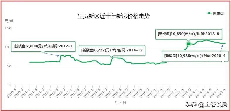 呈贡房价上涨有两个重要的时间节点,第一个节点是在2009年前后,市府和高校的迁入,呈贡房价从3000元每平米,翻了一倍到6000元每平米。